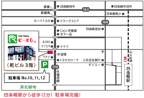 お車でお越しのお客様は、店舗南側にある辰巳建設左の駐車場 (10・11・12番) をご利用ください。